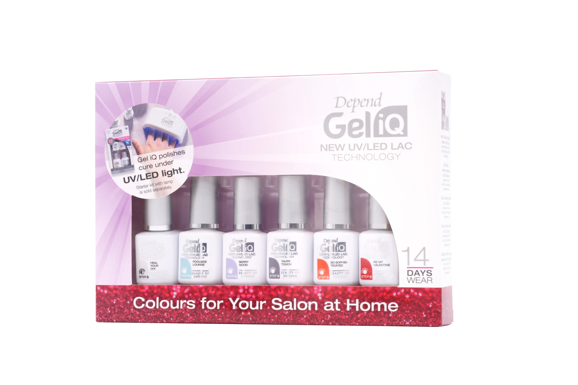Dependin Gel iQ 6 Pack -setissä on kuusi erilaista Gel iQ -geelilakkaa. Gel iQ Gel Polish -geelilakka kovettuu vain UV/LED-valon alla.  Sävyt vaihtelevat.