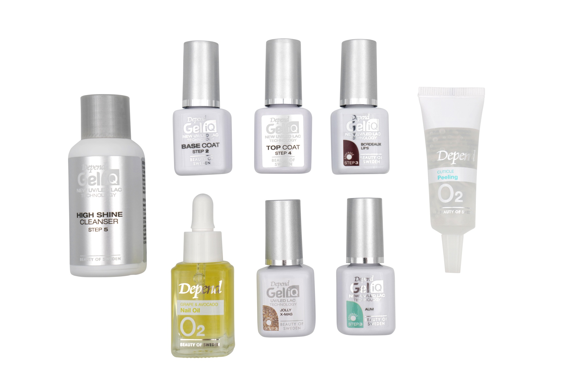 • 18 x 5 ml geelilakkaa sävyt: Pure White 1000, French Pink 1002, Let's Be Pirates 1010, Bordeaux Lips 1033, Heal Your Chi 1062, Love Yourself 1063, Less, But Better 1076, Own Your Style 1081, Pink Starfish 1087, Pink Sculpt 1110, Green Out 1112, Aum 1114, Yoga 1116, Mantra 1118, Jingle & Mingle 10113, Jolly X-Mas 10116, Sweets & Nuts 10117, Christmas Wishes 10118.