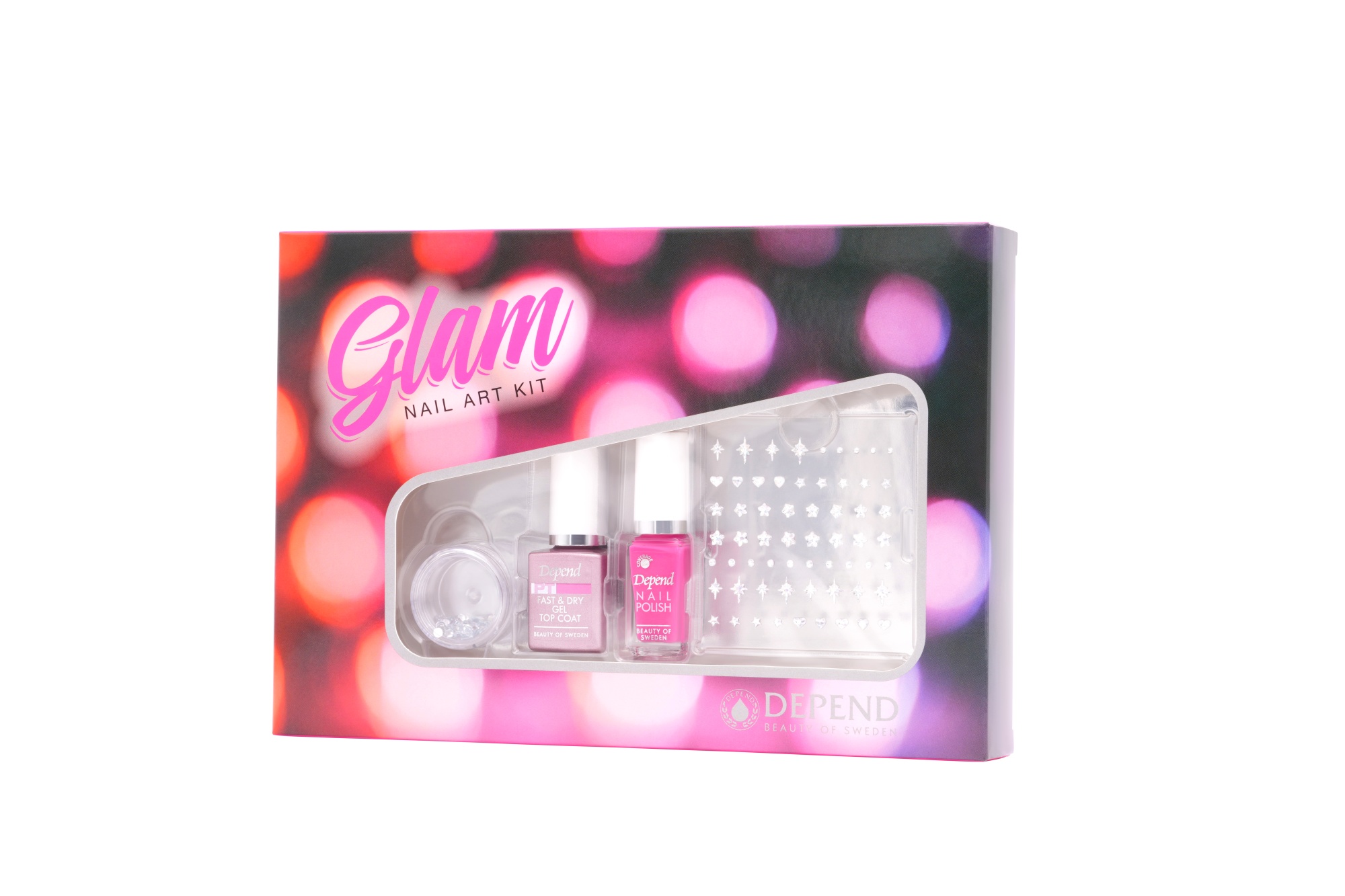 Kynsienkoristelisetti, joka sisältää Fast & Dry päällyslakan, värilakan, koristelukiviä sekä kynsitarroja.
