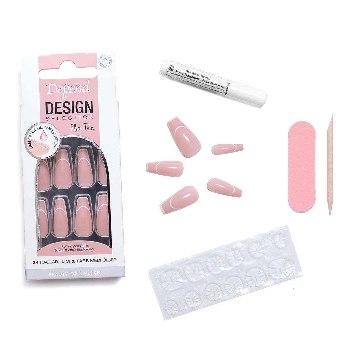 Tyylikkäät tekokynnet, joilla saa trendikkään ilmeen vain muutamassa minuutissa. Täydellisesti istuvat Flexi-Thin-tekokynnet on helppo kiinnittää mukana tulevalla liimalla tai tarroilla (kaksipuolinen kynsiteippi). Tarkat käyttöohjeet pakkauksessa.