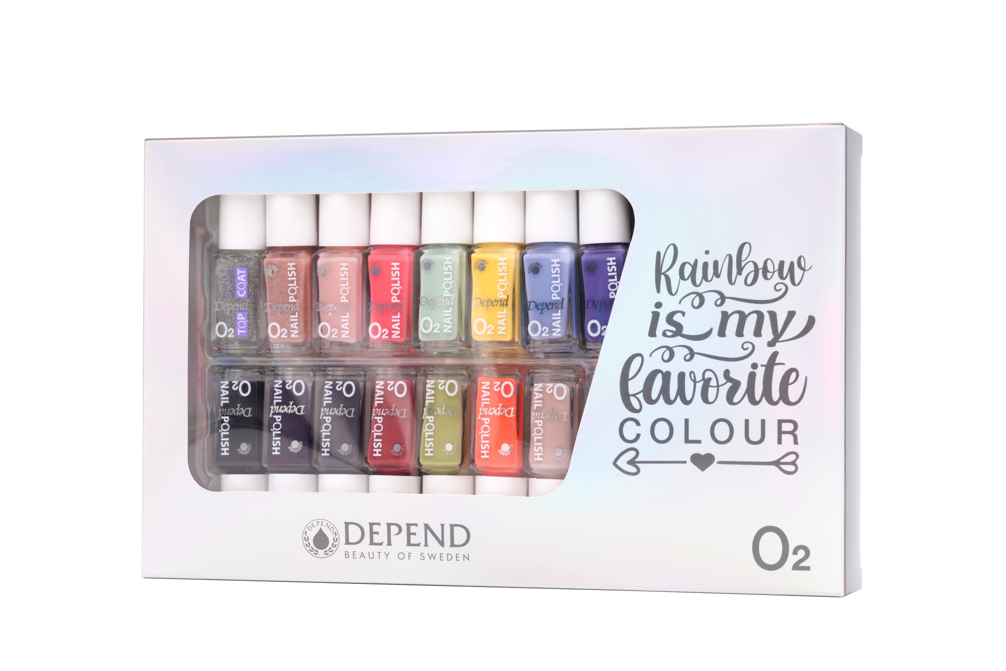 Setti sisältää 15 Depend O2 minikynsilakkaa. Sävyt vaihtelevat pakkauksittain.