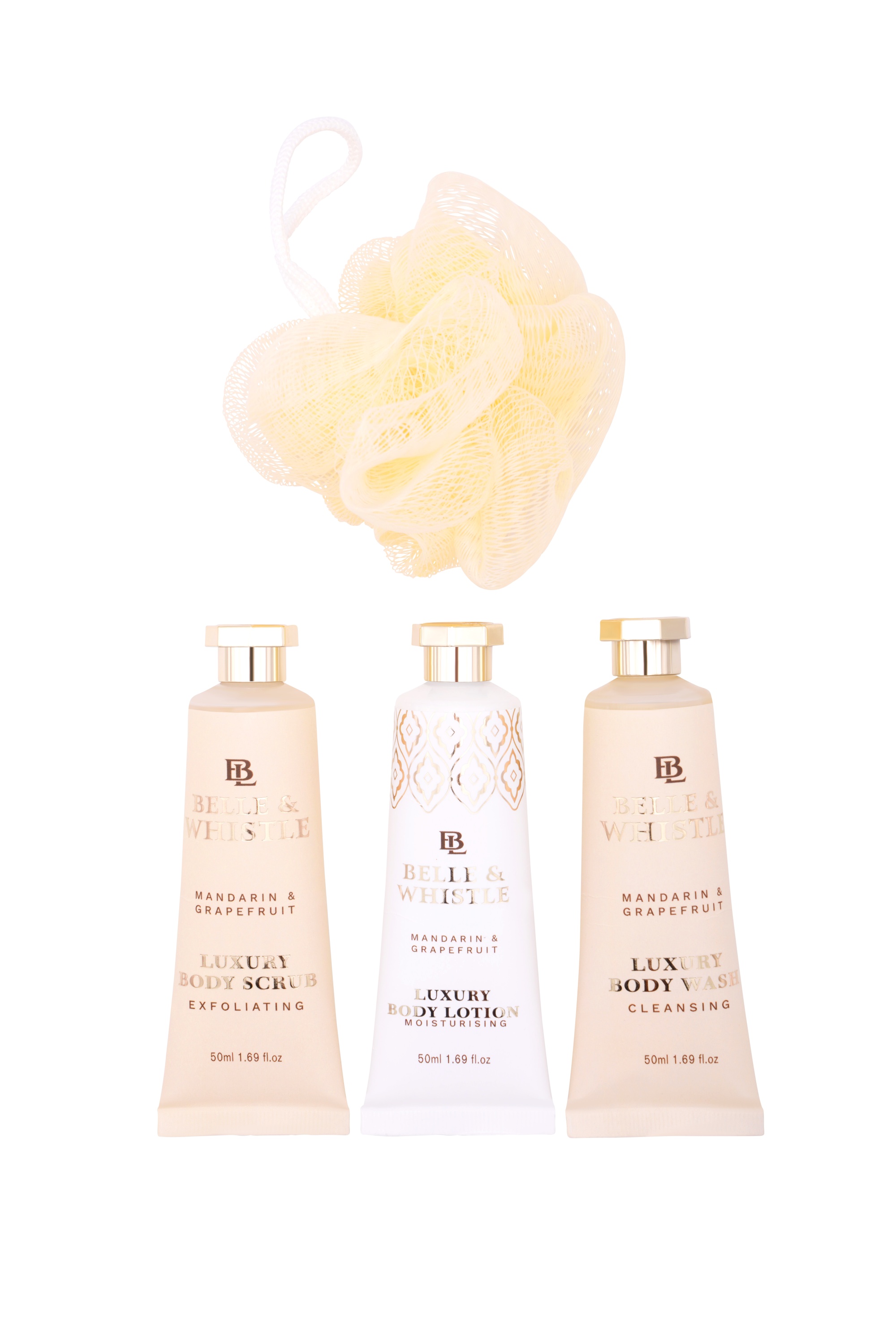 Lahjasetti, joka sisältää suihkugeelin 50 ml, Vartalokuorinnan 50 ml sekä vartalovoiteen 50ml.
