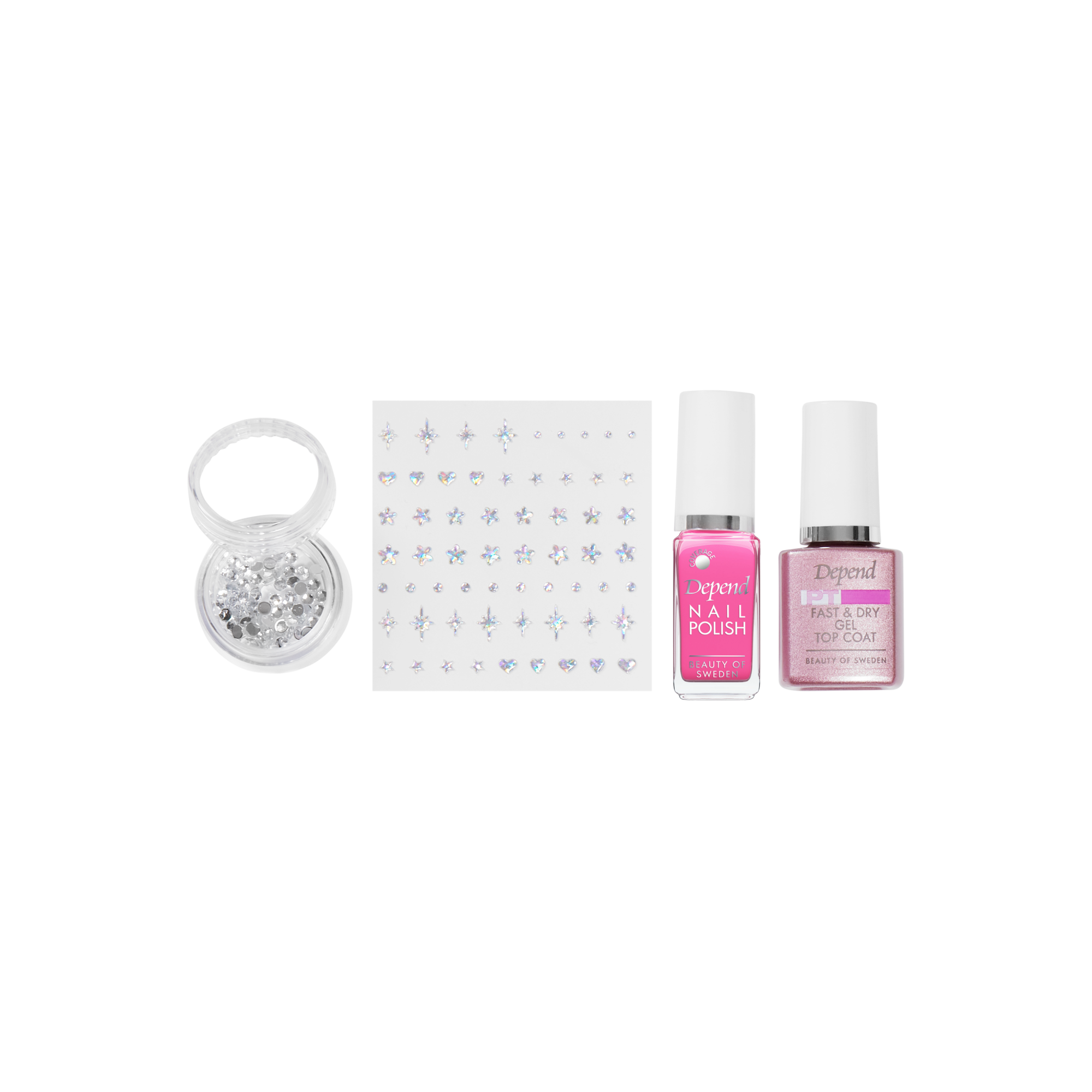 Kynsienkoristelisetti, joka sisältää Fast & Dry päällyslakan, värilakan, koristelukiviä sekä kynsitarroja.